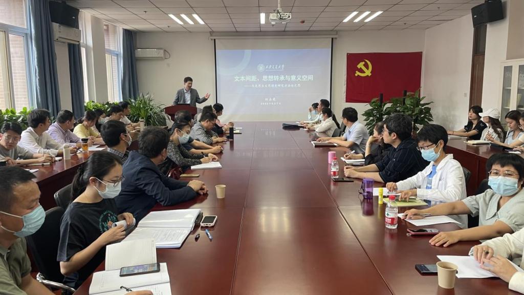 6月7日下午,马克思主义学院开展思政工作坊活动,特别邀请西安交通大学博士生导师刘占虎教授应邀作了题为“文本间距、思想转承与意义空间——马克思主义思想史研究方法论之思”的学术报告。报告会由院长袁文伟教授主持,马院教师及全体研究生聆听了报告。