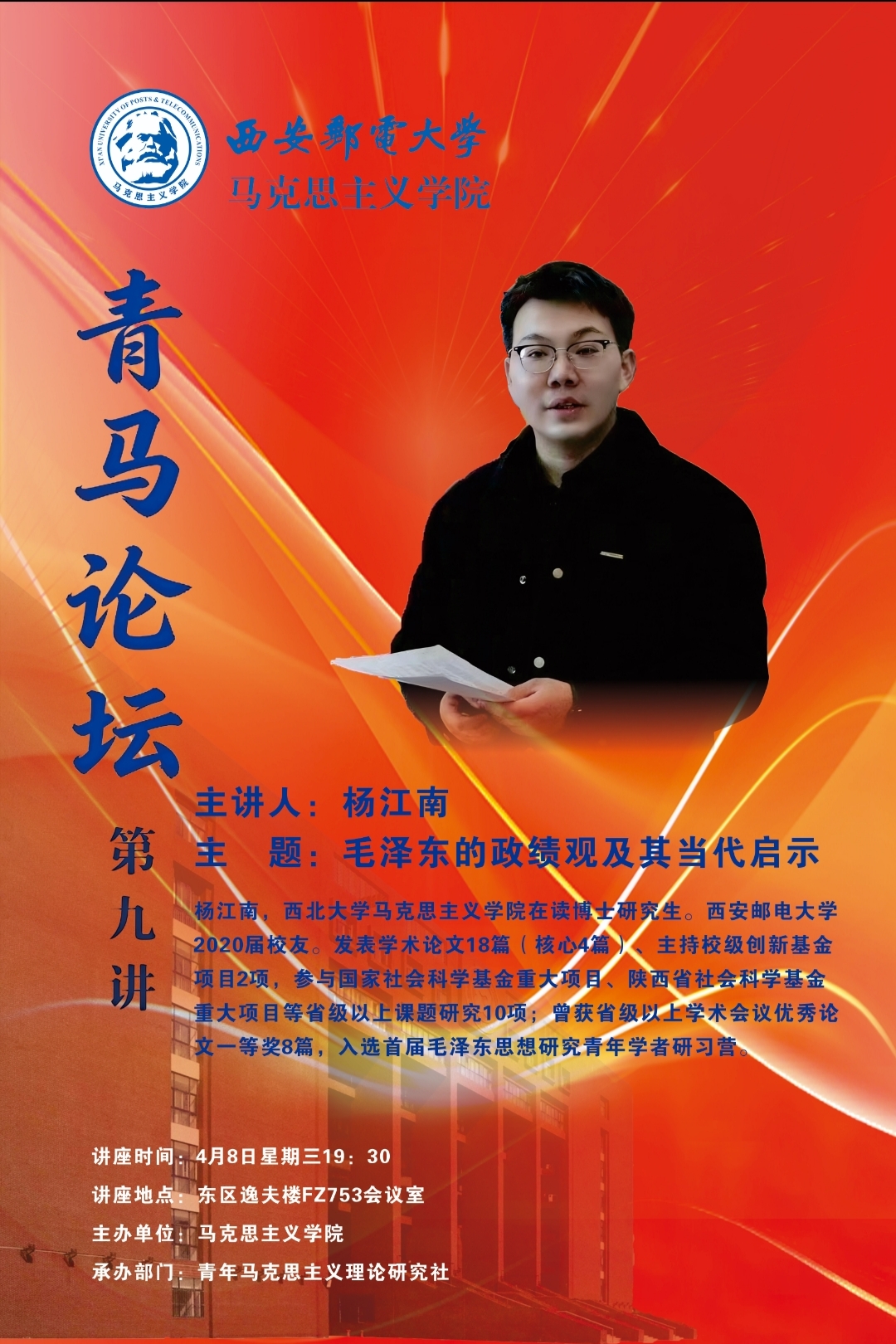 4月8日,马克思主义学院第九期青马论坛在长安校区东区逸夫楼FZ753会议室举办。本次论坛特别邀请西北大学马克思主义学院在读博士、西安邮电大学2023届优秀校友杨江南返校作专题学术报告与成长经验分享。学院院长袁文伟主持报告会,学院2024级、2025级全体研究生参加活动。